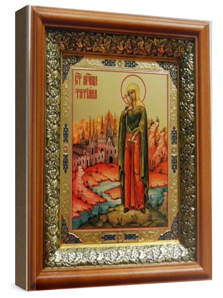 Икона татьяна римская (19х22), светлый киот. Лик нанесен методом объемного тиснения фолиевыми красками по золотой фольге, что гарантирует максимально долгую сохранность яркости изображения. Полный размер иконы с киотом: 19x22 см. Икона под стеклом. Киот (рамка) изготовлен из березы и украшен басмой (узор из черненой меди в виде виноградной лозы).