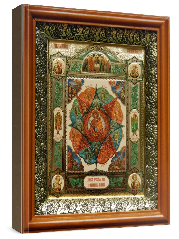 Икона неопалимая купина (19х22), светлый киот. Лик нанесен методом объемного тиснения фолиевыми красками по золотой фольге, что гарантирует максимально долгую сохранность яркости изображения. Полный размер иконы с киотом: 19x22 см. Икона под стеклом. Киот (рамка) изготовлен из березы и украшен басмой (узор из черненой меди в виде виноградной лозы).