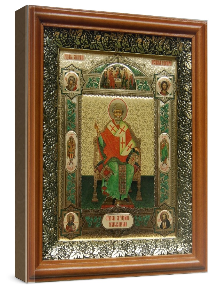 Икона спиридон тримифунтский (19х22), светлый киот. Лик нанесен методом объемного тиснения фолиевыми красками по золотой фольге, что гарантирует максимально долгую сохранность яркости изображения. Полный размер иконы с киотом: 19x22 см. Икона под стеклом. Киот (рамка) изготовлен из березы и украшен басмой (узор из черненой меди в виде виноградной лозы).