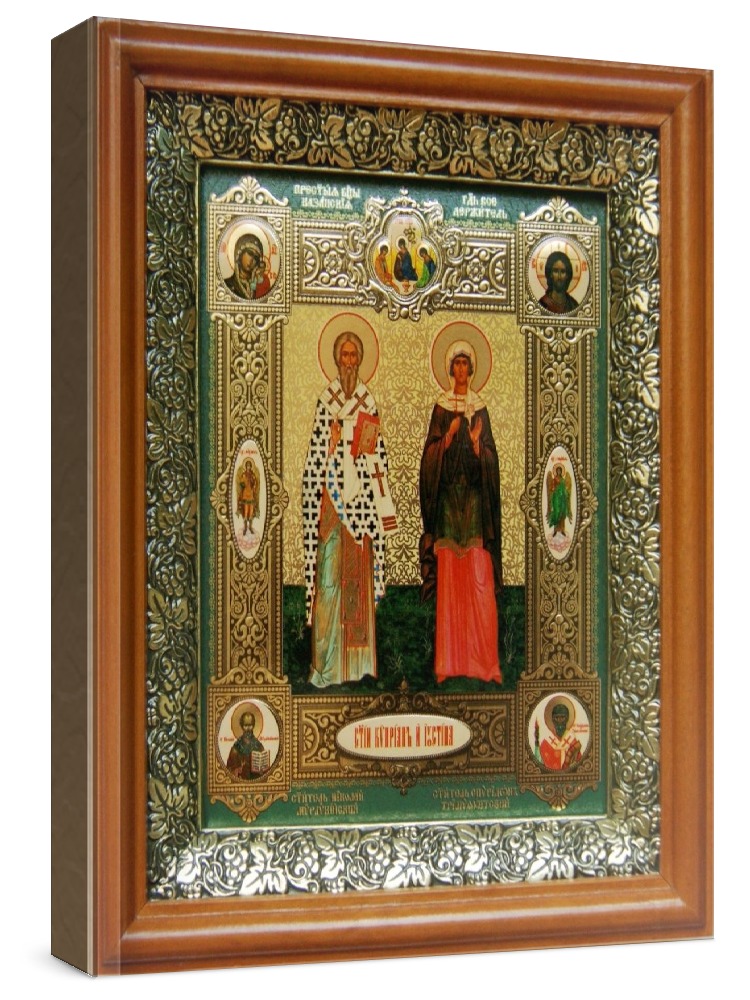Икона киприан и иустина (19х22), светлый киот. Лик нанесен методом объемного тиснения фолиевыми красками по золотой фольге, что гарантирует максимально долгую сохранность яркости изображения. Полный размер иконы с киотом: 19x22 см. Икона под стеклом. Киот (рамка) изготовлен из березы и украшен басмой (узор из черненой меди в виде виноградной лозы).