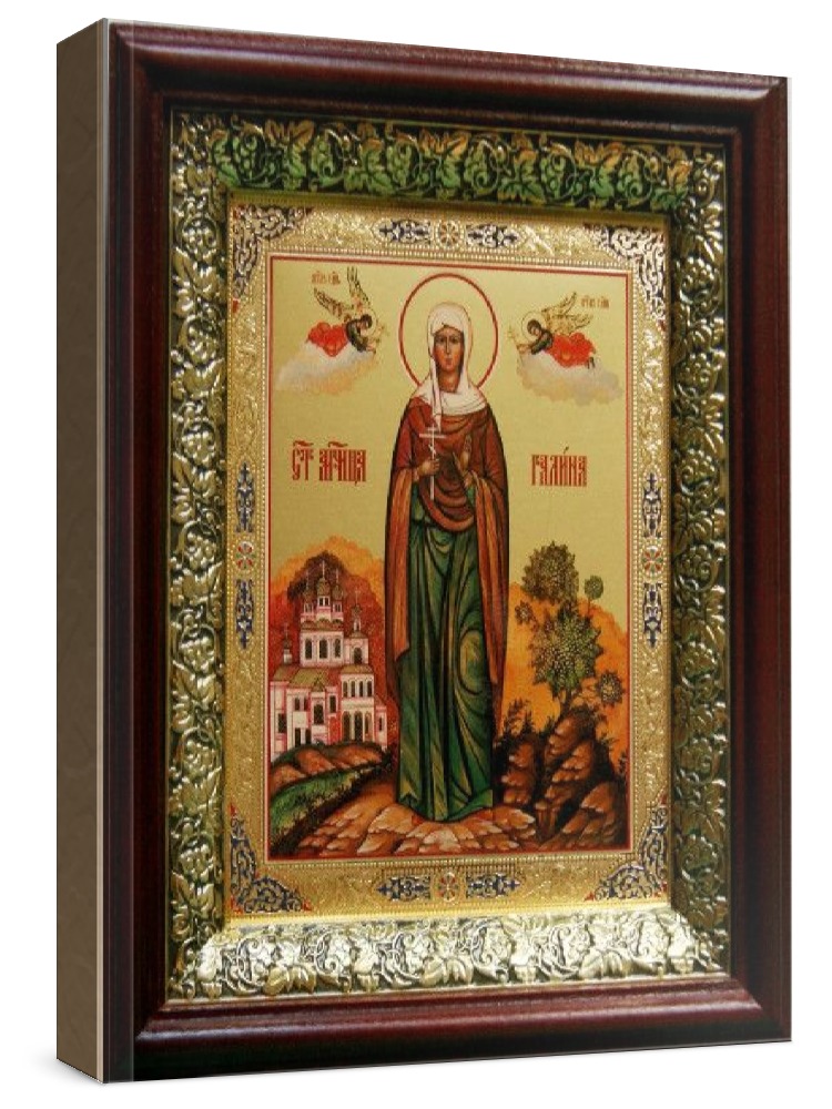 Икона галина коринфская (19х22), темный киот. Лик нанесен методом объемного тиснения фолиевыми красками по золотой фольге, что гарантирует максимально долгую сохранность яркости изображения. Полный размер иконы с киотом: 19x22 см. Икона под стеклом. Киот (рамка) изготовлен из березы и украшен басмой (узор из черненой меди в виде виноградной лозы).