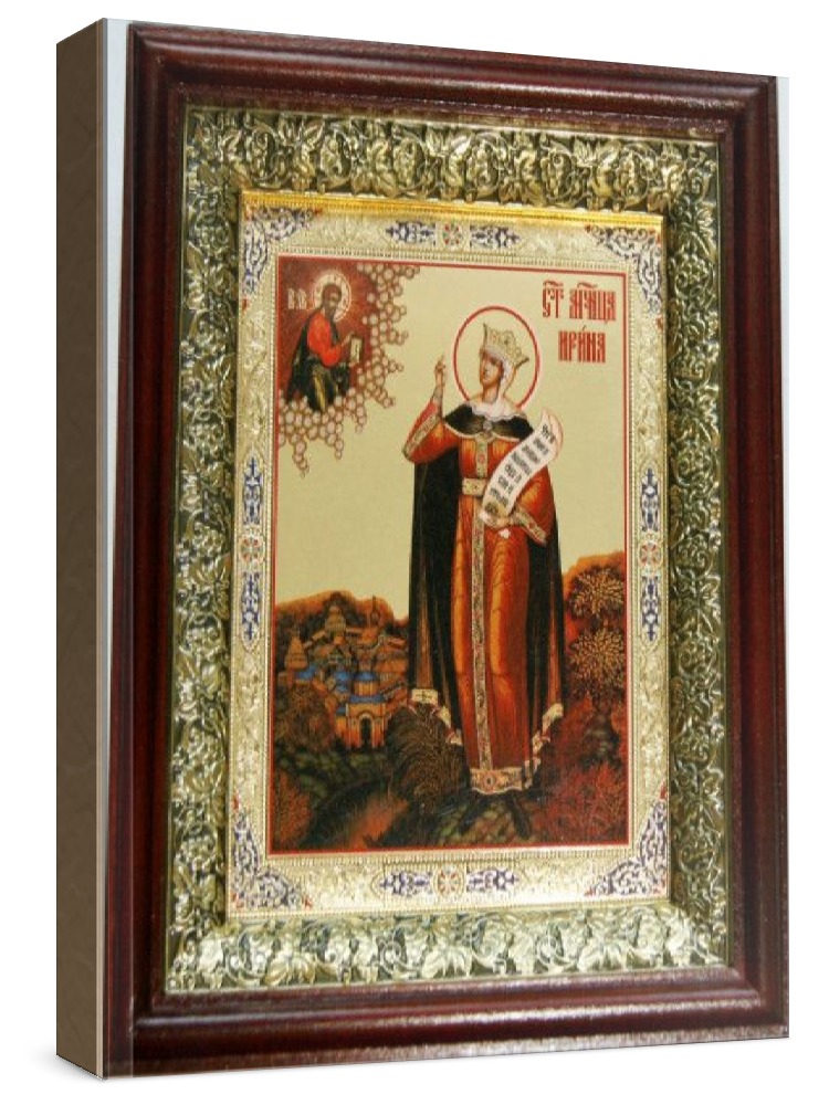 Икона ирина македонская (19х22), темный киот. Лик нанесен методом объемного тиснения фолиевыми красками по золотой фольге, что гарантирует максимально долгую сохранность яркости изображения. Полный размер иконы с киотом: 19x22 см. Икона под стеклом. Киот (рамка) изготовлен из березы и украшен басмой (узор из черненой меди в виде виноградной лозы).