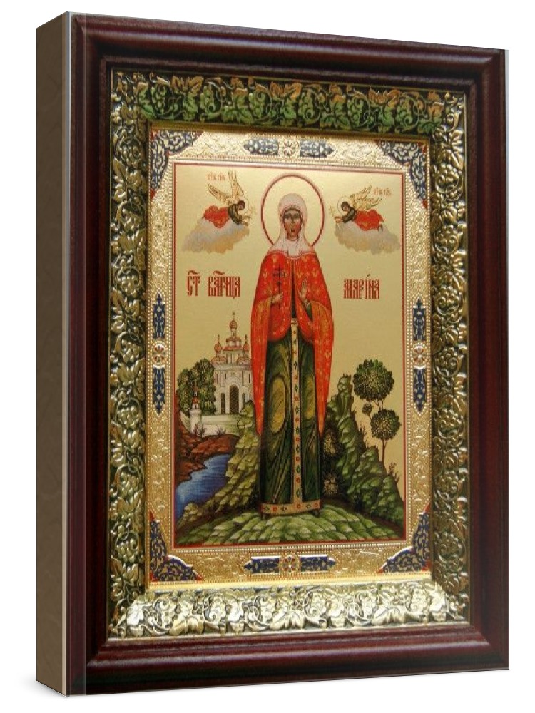 Икона марина антиохийская (19х22), темный киот.     Лик нанесен методом объемного тиснения фолиевыми красками по золотой фольге, что гарантирует максимально долгую сохранность яркости изображения.  Полный размер иконы с киотом: 19x22 см.  Икона под стеклом. Киот (рамка) изготовлен из березы и украшен басмой (узор из черненой меди в виде виноградной лозы).