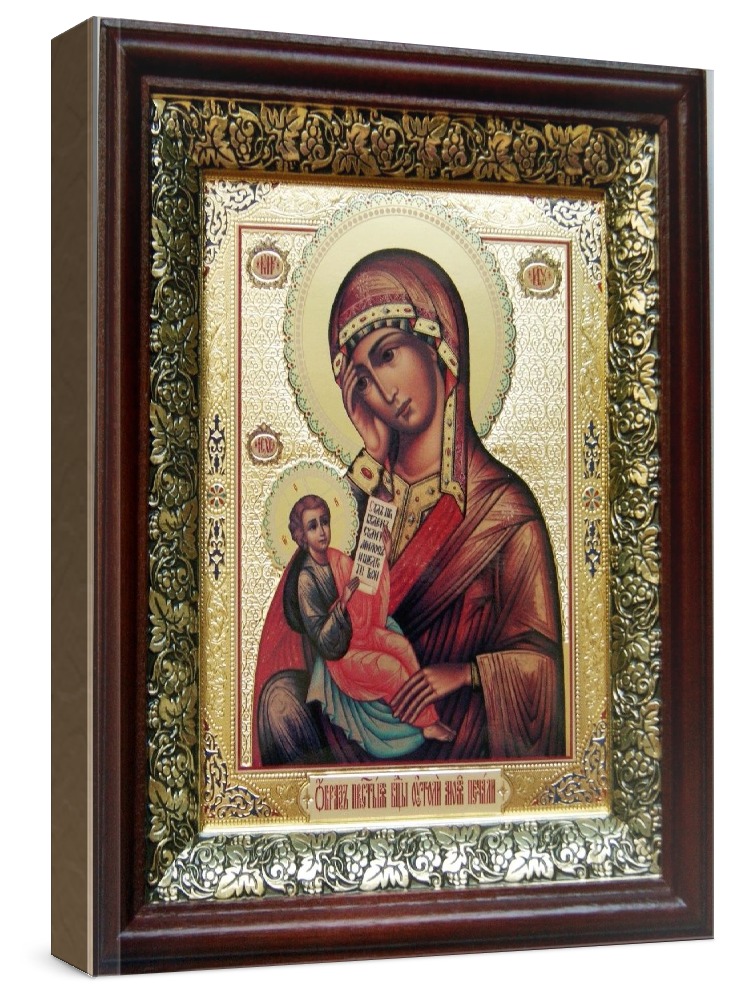Икона утоли моя печали (19х22), темный киот. Лик нанесен методом объемного тиснения фолиевыми красками по золотой фольге, что гарантирует максимально долгую сохранность яркости изображения. Полный размер иконы с киотом: 19x22 см. Икона под стеклом. Киот (рамка) изготовлен из березы и украшен басмой (узор из черненой меди в виде виноградной лозы).