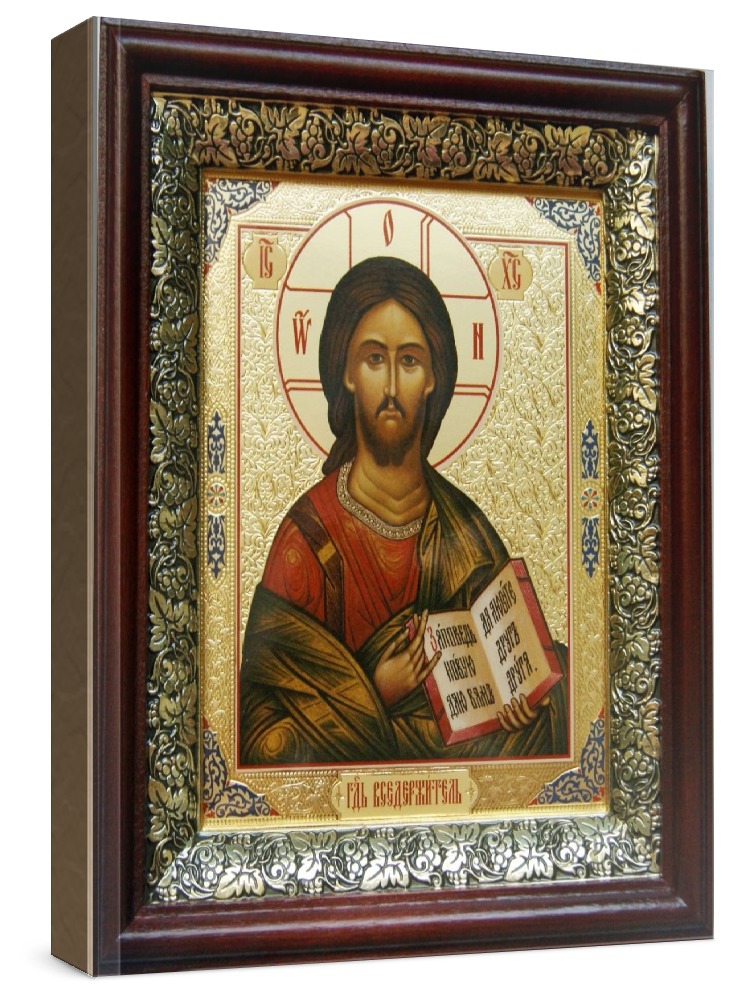 Икона спас вседержитель (19х22), темный киот. Лик нанесен методом объемного тиснения фолиевыми красками по золотой фольге, что гарантирует максимально долгую сохранность яркости изображения. Полный размер иконы с киотом: 19x22 см. Икона под стеклом. Киот (рамка) изготовлен из березы и украшен басмой (узор из черненой меди в виде виноградной лозы).