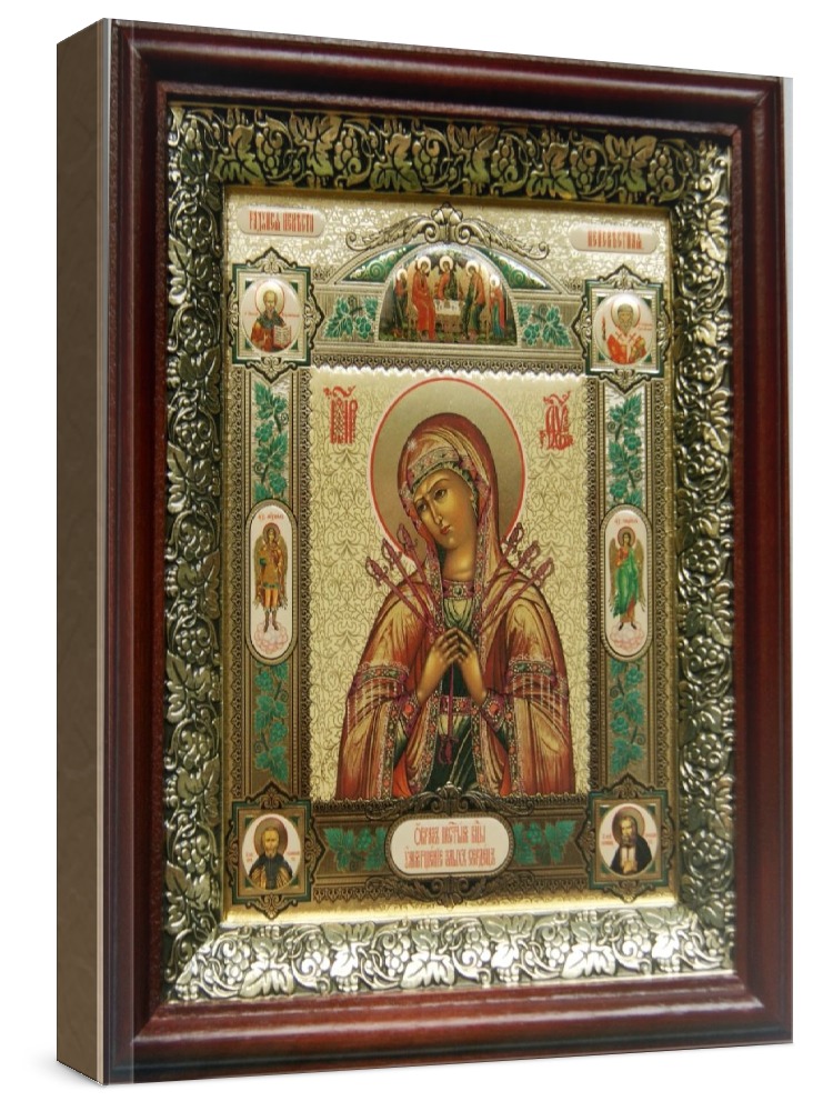 Икона умягчение злых сердец (19х22), темный киот. Лик нанесен методом объемного тиснения фолиевыми красками по золотой фольге, что гарантирует максимально долгую сохранность яркости изображения. Полный размер иконы с киотом: 19x22 см. Икона под стеклом. Киот (рамка) изготовлен из березы и украшен басмой (узор из черненой меди в виде виноградной лозы).