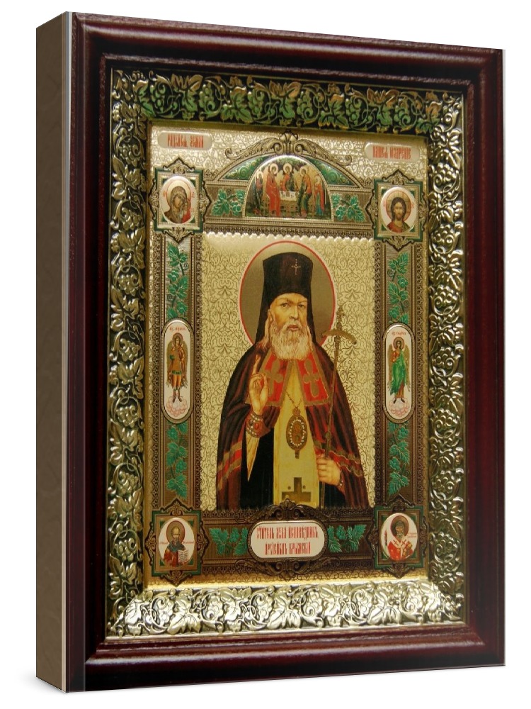 Икона лука крымский (19х22), темный киот. Лик нанесен методом объемного тиснения фолиевыми красками по золотой фольге, что гарантирует максимально долгую сохранность яркости изображения. Полный размер иконы с киотом: 19x22 см. Икона под стеклом. Киот (рамка) изготовлен из березы и украшен басмой (узор из черненой меди в виде виноградной лозы).