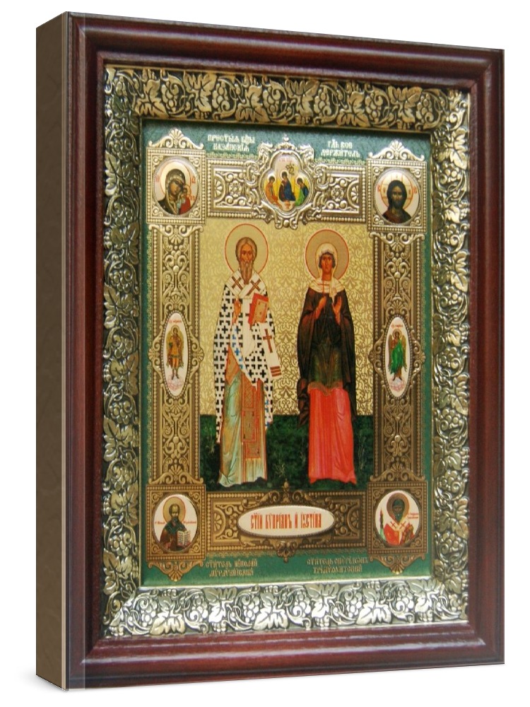 Икона киприан и иустина (19х22), темный киот. Лик нанесен методом объемного тиснения фолиевыми красками по золотой фольге, что гарантирует максимально долгую сохранность яркости изображения. Полный размер иконы с киотом: 19x22 см. Икона под стеклом. Киот (рамка) изготовлен из березы и украшен басмой (узор из черненой меди в виде виноградной лозы).