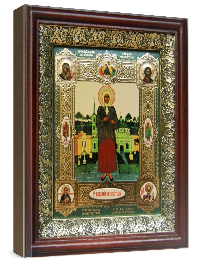 Икона ксения петербургская (19х22), темный киот. Лик нанесен методом объемного тиснения фолиевыми красками по золотой фольге, что гарантирует максимально долгую сохранность яркости изображения. Полный размер иконы с киотом: 19x22 см. Икона под стеклом. Киот (рамка) изготовлен из березы и украшен басмой (узор из черненой меди в виде виноградной лозы).
