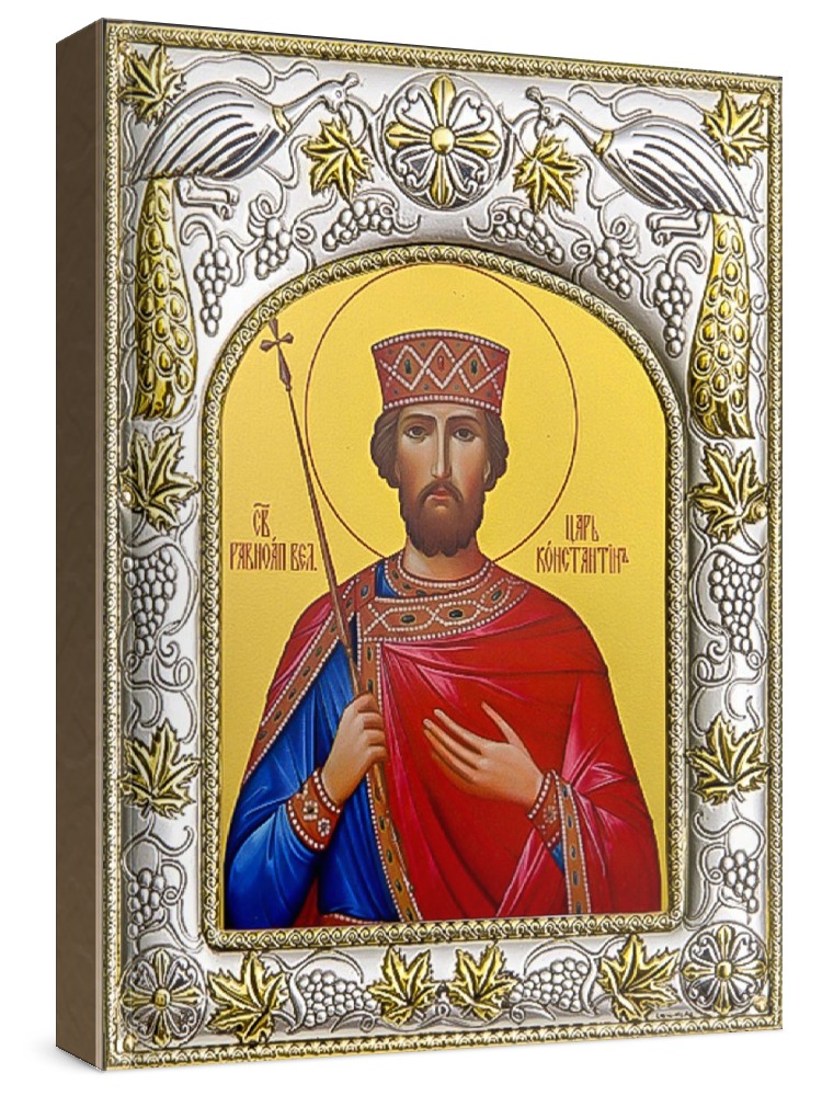 Икона константин великий (14х18), серебро. Икона выполнена на доске из дуба минеральными (природными) красками с использованием сусального золота по всем канонам Православия. Изображение трижды покрыто бесцветным лаком, что гарантирует долговечность, свежесть и чистоту красок. Оклад иконы выполнен из металлической основы, покрытой листовым серебром 925 пробы и 24-каратным золотом (имеется сертификат на обратной стороне). Икона упакована в коробку. Размер иконы: 14х18 см. Производство: Россия.