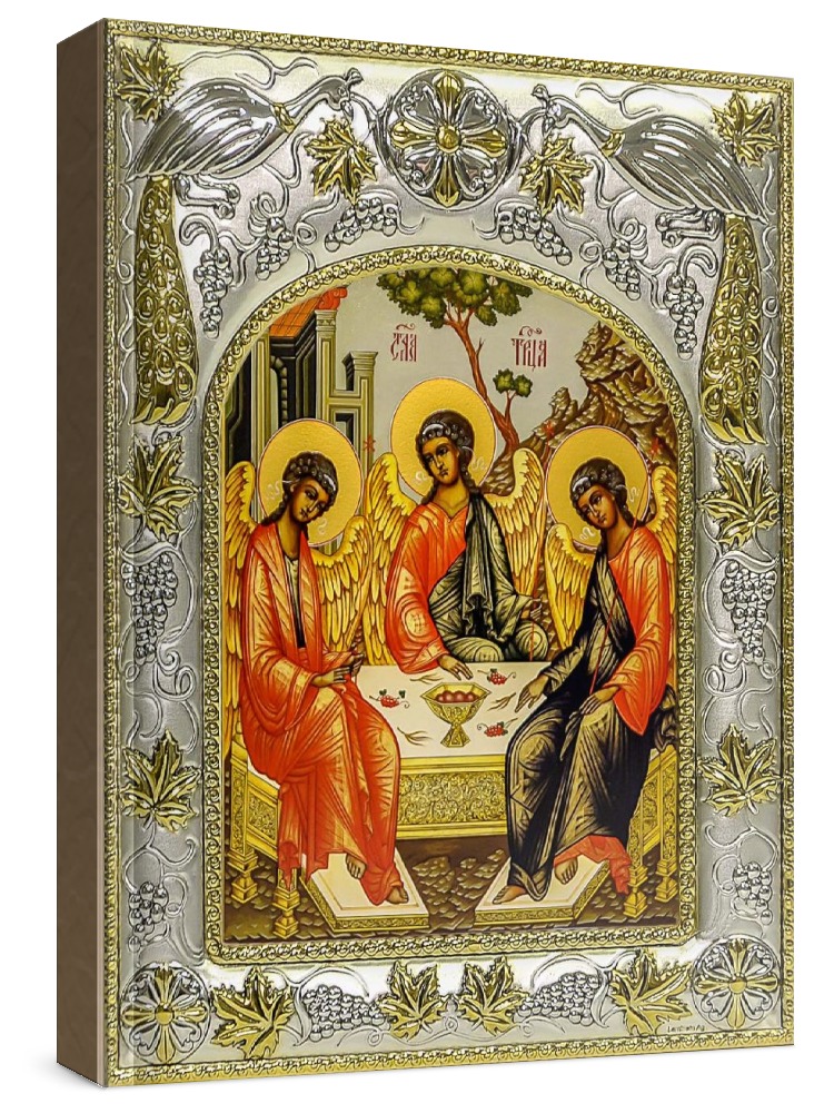Икона троица (14х18), серебро. Икона выполнена на доске из дуба минеральными (природными) красками с использованием сусального золота по всем канонам Православия. Изображение трижды покрыто бесцветным лаком, что гарантирует долговечность, свежесть и чистоту красок. Оклад иконы выполнен из металлической основы, покрытой листовым серебром 925 пробы и 24-каратным золотом (имеется сертификат на обратной стороне). Икона упакована в коробку. Размер иконы: 14х18 см. Производство: Россия.