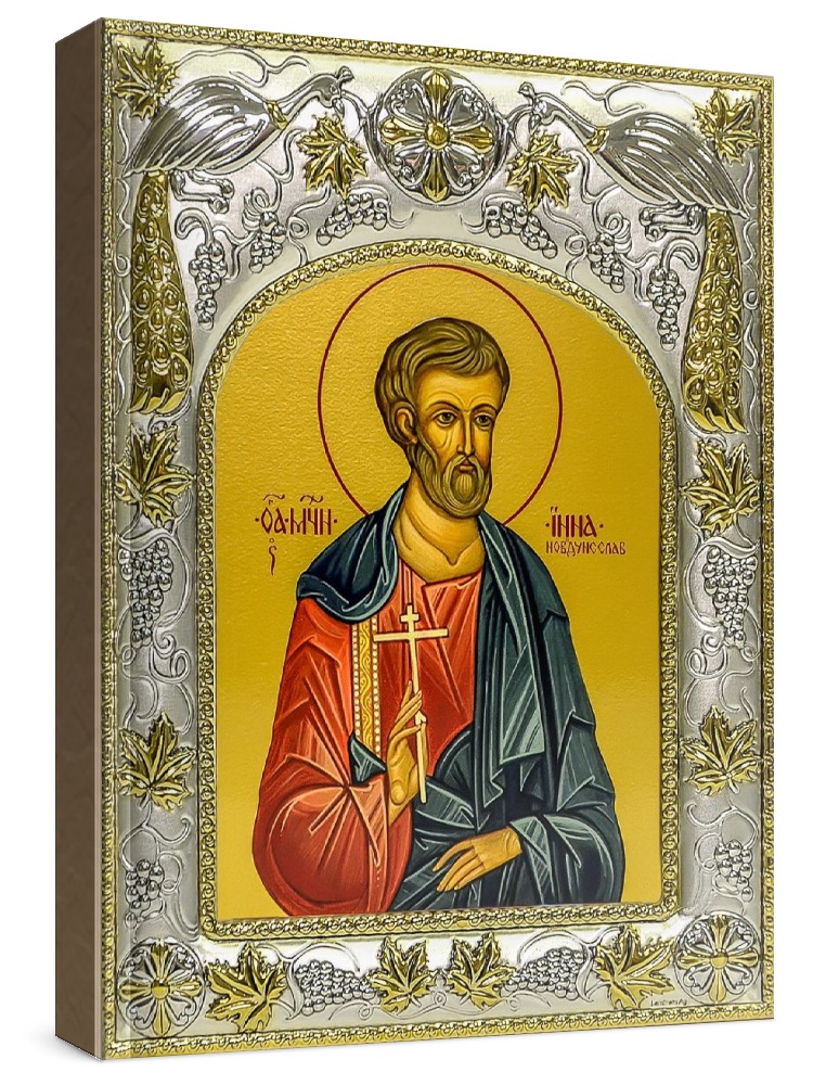 Икона инна новодунский (14х18), серебро. Икона выполнена на доске из дуба минеральными (природными) красками с использованием сусального золота по всем канонам Православия. Изображение трижды покрыто бесцветным лаком, что гарантирует долговечность, свежесть и чистоту красок. Оклад иконы выполнен из металлической основы, покрытой листовым серебром 925 пробы и 24-каратным золотом (имеется сертификат на обратной стороне). Икона упакована в коробку. Размер иконы: 14х18 см. Производство: Россия.