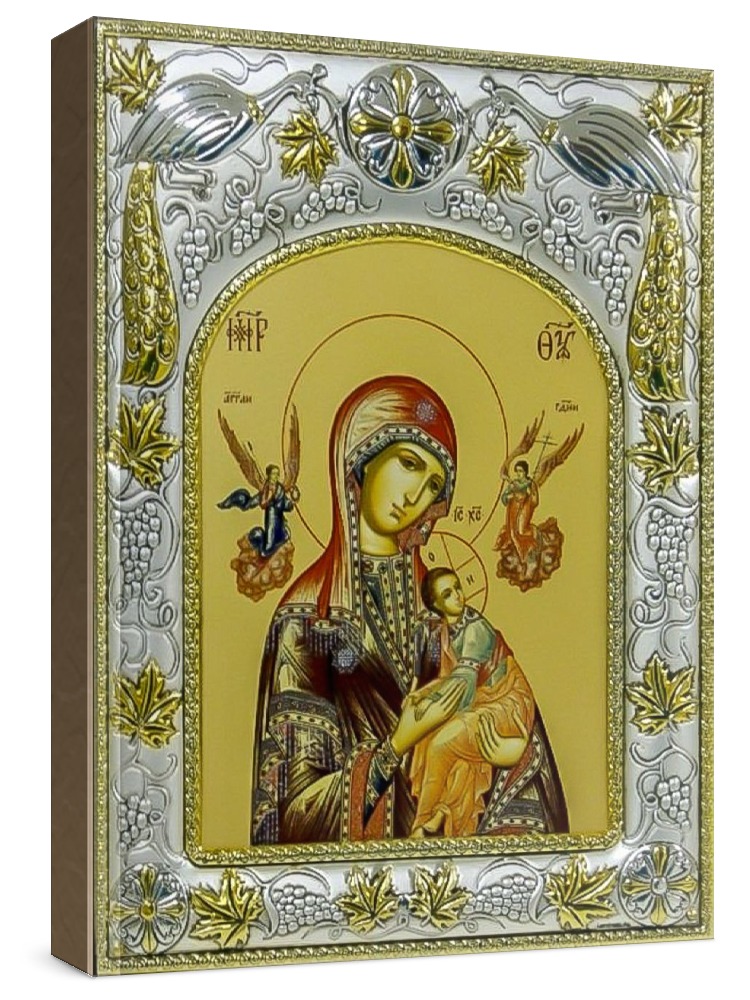 Страстная икона бм (14х18), серебро. Икона выполнена на доске из дуба минеральными (природными) красками с использованием сусального золота по всем канонам Православия. Изображение трижды покрыто бесцветным лаком, что гарантирует долговечность, свежесть и чистоту красок. Оклад иконы выполнен из металлической основы, покрытой листовым серебром 925 пробы и 24-каратным золотом (имеется сертификат на обратной стороне). Икона упакована в коробку. Размер иконы: 14х18 см. Производство: Россия.