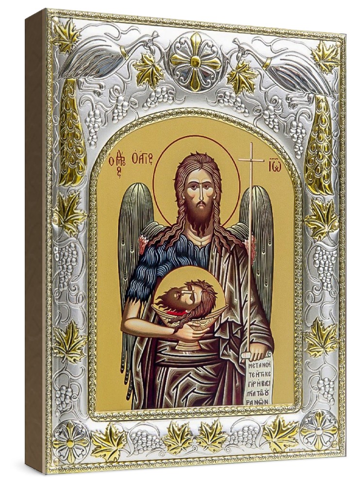 Икона иоанн предтеча (креститель) (14х18), серебро. Икона выполнена на доске из дуба минеральными (природными) красками с использованием сусального золота по всем канонам Православия. Изображение трижды покрыто бесцветным лаком, что гарантирует долговечность, свежесть и чистоту красок. Оклад иконы выполнен из металлической основы, покрытой листовым серебром 925 пробы и 24-каратным золотом (имеется сертификат на обратной стороне). Икона упакована в коробку. Размер иконы: 14х18 см. Производство: Россия.