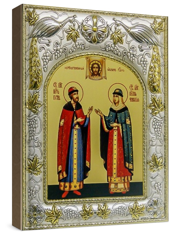 Икона петр и феврония (14х18), серебро. Икона выполнена на доске из дуба минеральными (природными) красками с использованием сусального золота по всем канонам Православия. Изображение трижды покрыто бесцветным лаком, что гарантирует долговечность, свежесть и чистоту красок. Оклад иконы выполнен из металлической основы, покрытой листовым серебром 925 пробы и 24-каратным золотом (имеется сертификат на обратной стороне). Икона упакована в коробку. Размер иконы: 14х18 см. Производство: Россия.