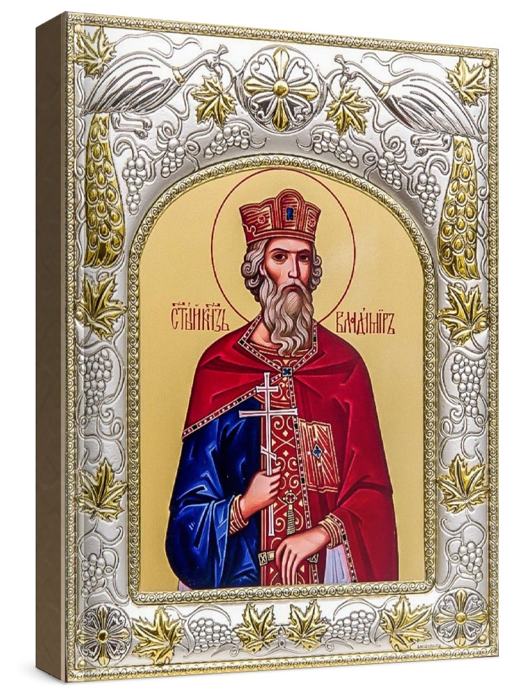 Икона владимир, князь (14х18), серебро. Икона выполнена на доске из дуба минеральными (природными) красками с использованием сусального золота по всем канонам Православия. Изображение трижды покрыто бесцветным лаком, что гарантирует долговечность, свежесть и чистоту красок. Оклад иконы выполнен из металлической основы, покрытой листовым серебром 925 пробы и 24-каратным золотом (имеется сертификат на обратной стороне). Икона упакована в коробку. Размер иконы: 14х18 см. Производство: Россия.