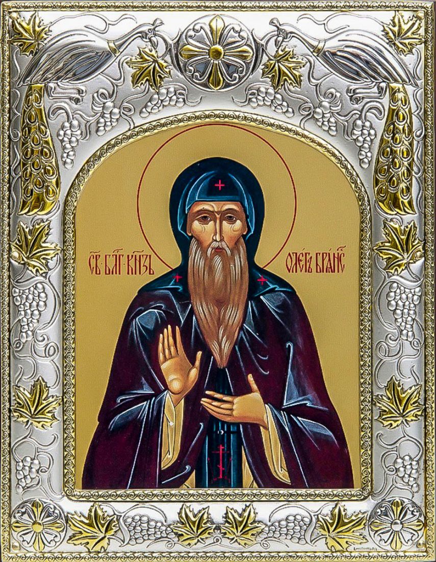 Икона олег брянский (14х18), серебро. Икона выполнена на доске из дуба минеральными (природными) красками с использованием сусального золота по всем канонам Православия. Изображение трижды покрыто бесцветным лаком, что гарантирует долговечность, свежесть и чистоту красок. Оклад иконы выполнен из металлической основы, покрытой листовым серебром 925 пробы и 24-каратным золотом (имеется сертификат на обратной стороне). Икона упакована в коробку. Размер иконы: 14х18 см. Производство: Россия.