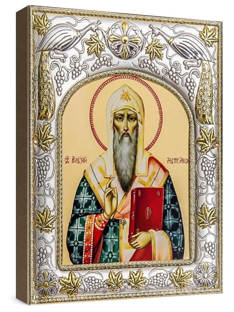 Икона алексий, митрополит московский (14х18). Икона выполнена на доске из дуба минеральными (природными) красками с использованием сусального золота по всем канонам Православия. Изображение трижды покрыто бесцветным лаком, что гарантирует долговечность, свежесть и чистоту красок. Оклад иконы выполнен из металлической основы, покрытой листовым серебром 925 пробы и 24-каратным золотом (имеется сертификат на обратной стороне). Икона упакована в коробку. Размер иконы: 14х18 см. Производство: Россия.