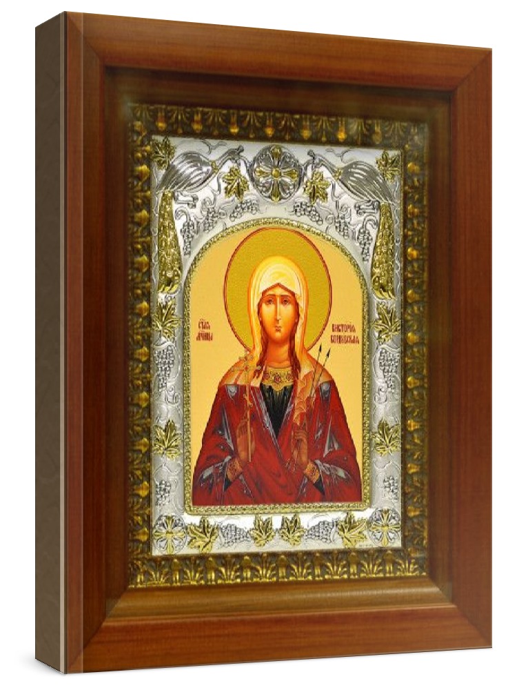 Икона виктория кордубская (20х24), серебро. Икона выполнена на доске из дуба минеральными (природными) красками с использованием сусального золота по всем канонам Православия. Изображение трижды покрыто бесцветным лаком, что гарантирует долговечность, свежесть и чистоту красок. Оклад иконы выполнен из металлической основы, покрытой листовым серебром 925 пробы и 24-каратным золотом (имеется сертификат на обратной стороне). Киот со стеклом, выполнен из массива дерева. Размер иконы с киотом: 20х24 см, без киота: 14х18 см. Производство: Россия.