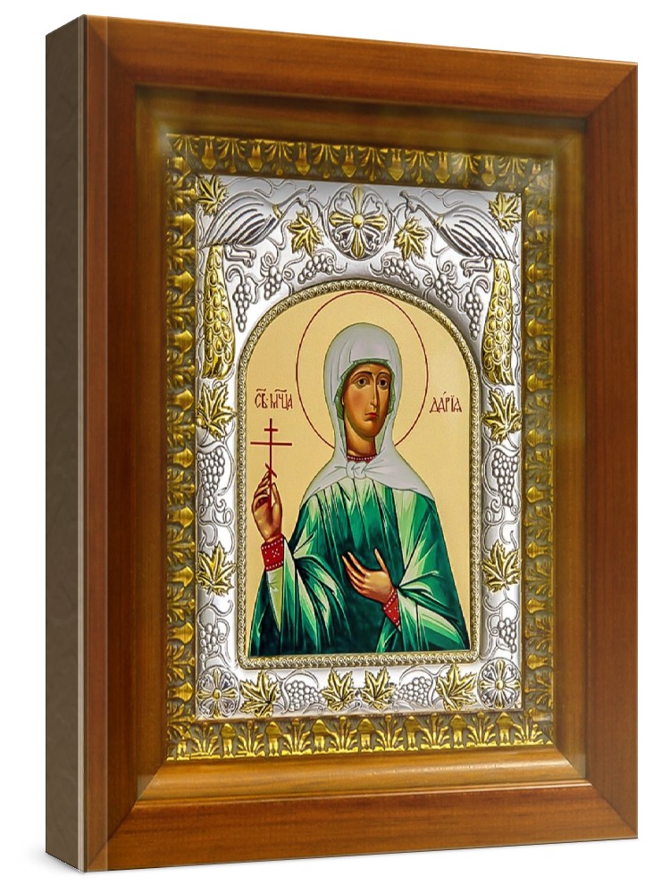 Икона дария римская (20х24), серебро. Икона выполнена на доске из дуба минеральными (природными) красками с использованием сусального золота по всем канонам Православия. Изображение трижды покрыто бесцветным лаком, что гарантирует долговечность, свежесть и чистоту красок. Оклад иконы выполнен из металлической основы, покрытой листовым серебром 925 пробы и 24-каратным золотом (имеется сертификат на обратной стороне). Киот со стеклом, выполнен из массива дерева. Размер иконы с киотом: 20х24 см, без киота: 14х18 см. Производство: Россия.