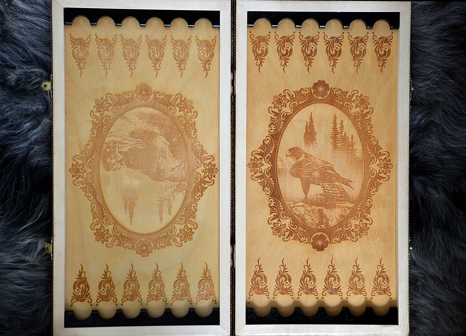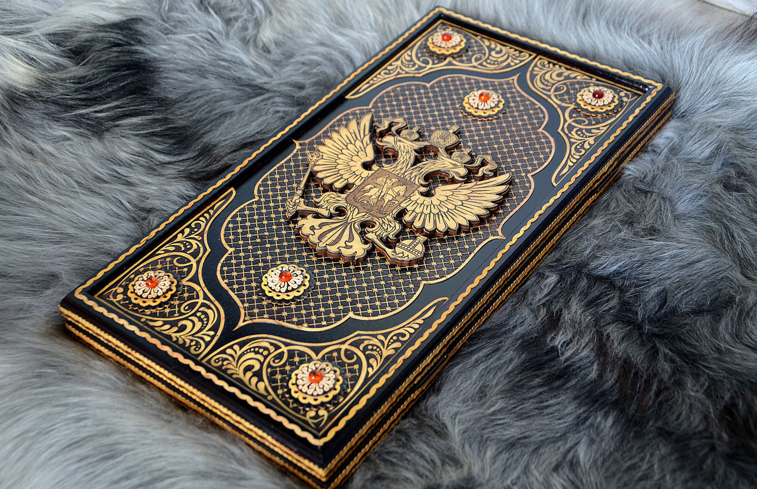 Нарды "герб рф" береста, янтарь, ручная работа. Материалы: дерево, береста, берёза, янтарь натуральный Размер: 210*400*40 Нарды сделаны из натуральных природных материалов, дерево, инкрустированы тисненой берестой. Внутри лазерная гравировка. Тематика декора - герб РФ