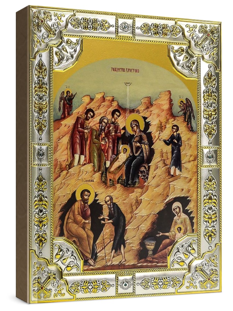 Икона рождество христово (18х24), серебро. Икона выполнена на доске из дуба минеральными (природными) красками с использованием сусального золота по всем канонам Православия. Изображение трижды покрыто бесцветным лаком, что гарантирует долговечность, свежесть и чистоту красок. Оклад иконы выполнен из металлической основы, покрытой листовым серебром 925 пробы и 24-каратным золотом (имеется сертификат на обратной стороне), украшен стразами. Икона упакована в коробку. Размер иконы: 18х24 см. Производство: Италия-Россия.