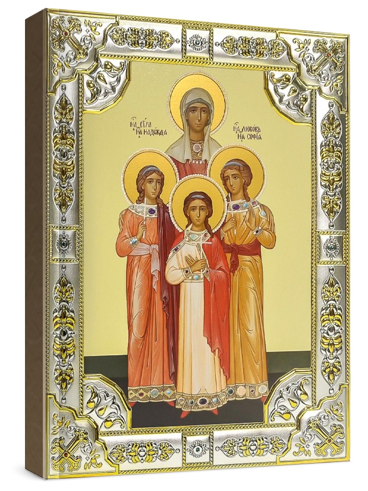 Икона вера, надежда, любовь и софия (18х24), серебро. Икона выполнена на доске из дуба минеральными (природными) красками с использованием сусального золота по всем канонам Православия. Изображение трижды покрыто бесцветным лаком, что гарантирует долговечность, свежесть и чистоту красок. Оклад иконы выполнен из металлической основы, покрытой листовым серебром 925 пробы и 24-каратным золотом (имеется сертификат на обратной стороне), украшен стразами. Икона упакована в коробку. Размер иконы: 18х24 см. Производство: Италия-Россия.