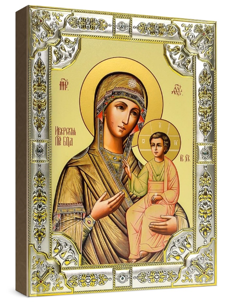 Иверская икона бм (18х24), серебро. Икона выполнена на доске из дуба минеральными (природными) красками с использованием сусального золота по всем канонам Православия. Изображение трижды покрыто бесцветным лаком, что гарантирует долговечность, свежесть и чистоту красок. Оклад иконы выполнен из металлической основы, покрытой листовым серебром 925 пробы и 24-каратным золотом (имеется сертификат на обратной стороне), украшен стразами. Икона упакована в коробку. Размер иконы: 18х24 см. Производство: Италия-Россия.
