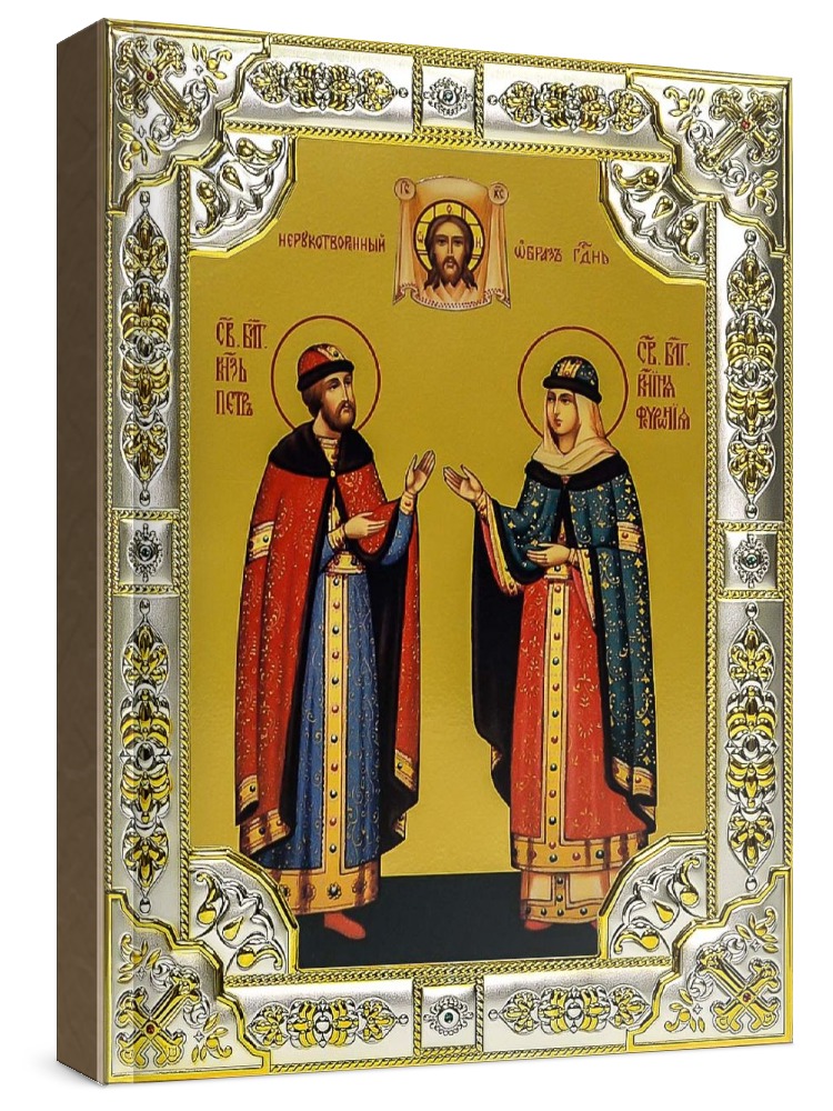 Икона петр и феврония муромские (18х24), серебро. Икона выполнена на доске из дуба минеральными (природными) красками с использованием сусального золота по всем канонам Православия. Изображение трижды покрыто бесцветным лаком, что гарантирует долговечность, свежесть и чистоту красок. Оклад иконы выполнен из металлической основы, покрытой листовым серебром 925 пробы и 24-каратным золотом (имеется сертификат на обратной стороне), украшен стразами. Икона упакована в коробку. Размер иконы: 18х24 см. Производство: Италия-Россия.