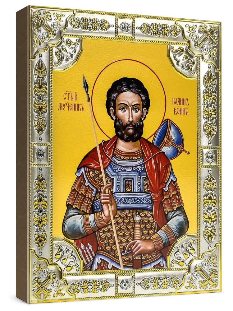 Икона иоанн воин (18х24), серебро. Икона выполнена на доске из дуба минеральными (природными) красками с использованием сусального золота по всем канонам Православия. Изображение трижды покрыто бесцветным лаком, что гарантирует долговечность, свежесть и чистоту красок. Оклад иконы выполнен из металлической основы, покрытой листовым серебром 925 пробы и 24-каратным золотом (имеется сертификат на обратной стороне), украшен стразами. Икона упакована в коробку. Размер иконы: 18х24 см. Производство: Италия-Россия.