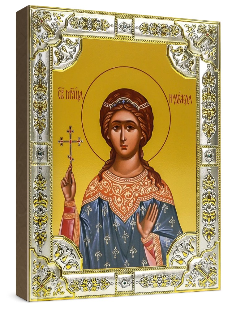 Икона надежда римская (18х24), серебро. Икона выполнена на доске из дуба минеральными (природными) красками с использованием сусального золота по всем канонам Православия. Изображение трижды покрыто бесцветным лаком, что гарантирует долговечность, свежесть и чистоту красок. Оклад иконы выполнен из металлической основы, покрытой листовым серебром 925 пробы и 24-каратным золотом (имеется сертификат на обратной стороне), украшен стразами. Икона упакована в коробку. Размер иконы: 18х24 см. Производство: Италия-Россия.