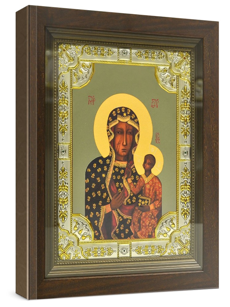 Ченстоховская икона божией матери (24х30), серебро. Икона выполнена на доске из дуба минеральными (природными) красками с использованием сусального золота по всем канонам Православия. Изображение трижды покрыто бесцветным лаком, что гарантирует долговечность, свежесть и чистоту красок. Оклад иконы выполнен из металлической основы, покрытой листовым серебром 925 пробы и 24-каратным золотом (имеется сертификат на обратной стороне), украшен стразами. Киот со стеклом, выполнен из массива дерева. Размер иконы с киотом: 24х30 см, без киота: 18х24 см. Производство: Италия-Россия.