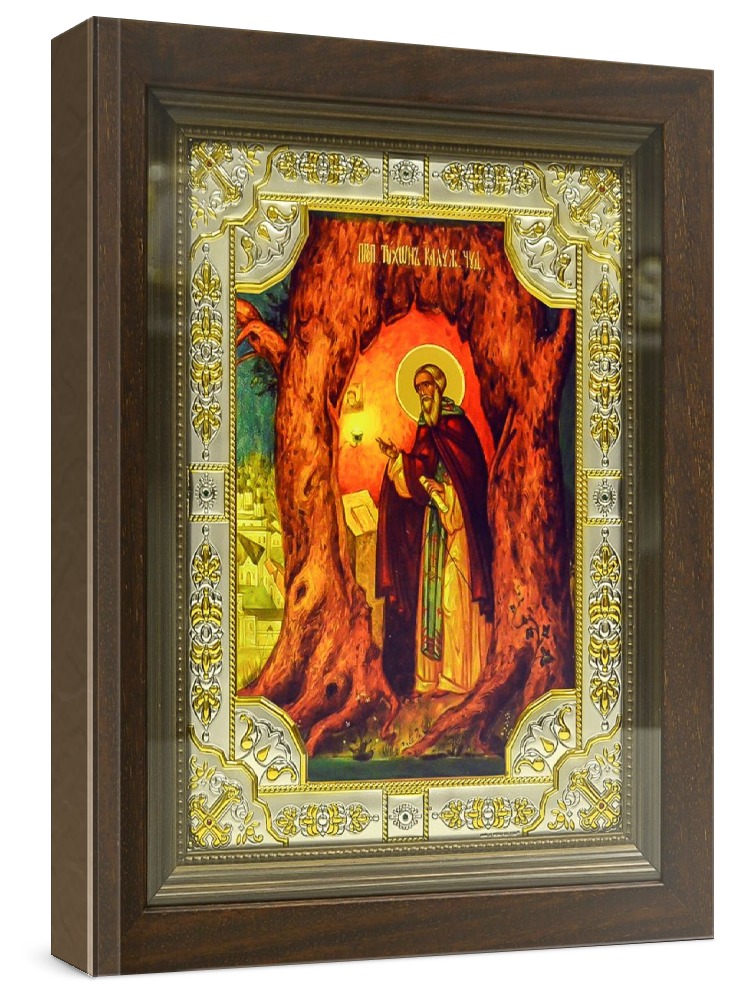 Икона тихон калужский (24х30), серебро. Икона выполнена на доске из дуба минеральными (природными) красками с использованием сусального золота по всем канонам Православия. Изображение трижды покрыто бесцветным лаком, что гарантирует долговечность, свежесть и чистоту красок. Оклад иконы выполнен из металлической основы, покрытой листовым серебром 925 пробы и 24-каратным золотом (имеется сертификат на обратной стороне), украшен стразами. Киот со стеклом, выполнен из массива дерева. Размер иконы с киотом: 24х30 см, без киота: 18х24 см. Производство: Италия-Россия.