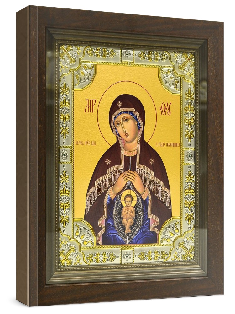 Икона помощница в родах (24х30), серебро. Икона выполнена на доске из дуба минеральными (природными) красками с использованием сусального золота по всем канонам Православия. Изображение трижды покрыто бесцветным лаком, что гарантирует долговечность, свежесть и чистоту красок. Оклад иконы выполнен из металлической основы, покрытой листовым серебром 925 пробы и 24-каратным золотом (имеется сертификат на обратной стороне), украшен стразами. Киот со стеклом, выполнен из массива дерева. Размер иконы с киотом: 24х30 см, без киота: 18х24 см. Производство: Италия-Россия.