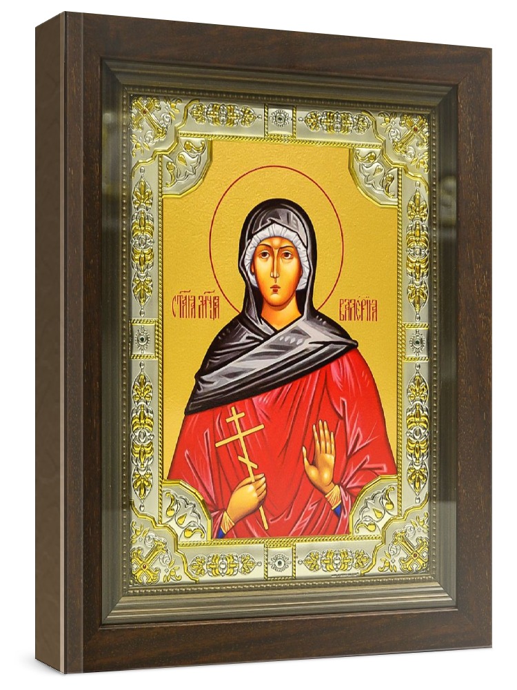 Икона валерия кесарийская (24х30), серебро. Икона выполнена на доске из дуба минеральными (природными) красками с использованием сусального золота по всем канонам Православия. Изображение трижды покрыто бесцветным лаком, что гарантирует долговечность, свежесть и чистоту красок. Оклад иконы выполнен из металлической основы, покрытой листовым серебром 925 пробы и 24-каратным золотом (имеется сертификат на обратной стороне), украшен стразами. Киот со стеклом, выполнен из массива дерева. Размер иконы с киотом: 24х30 см, без киота: 18х24 см. Производство: Италия-Россия.