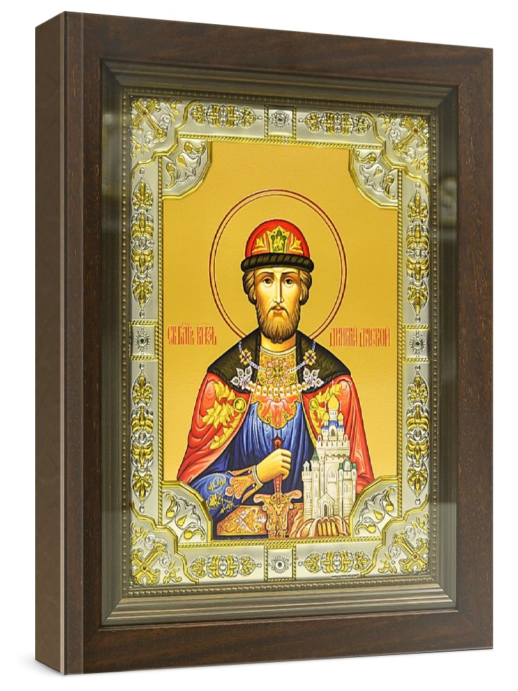 Икона дмитрий донской (24х30), серебро. Икона выполнена на доске из дуба минеральными (природными) красками с использованием сусального золота по всем канонам Православия. Изображение трижды покрыто бесцветным лаком, что гарантирует долговечность, свежесть и чистоту красок. Оклад иконы выполнен из металлической основы, покрытой листовым серебром 925 пробы и 24-каратным золотом (имеется сертификат на обратной стороне), украшен стразами. Киот со стеклом, выполнен из массива дерева. Размер иконы с киотом: 24х30 см, без киота: 18х24 см. Производство: Италия-Россия.