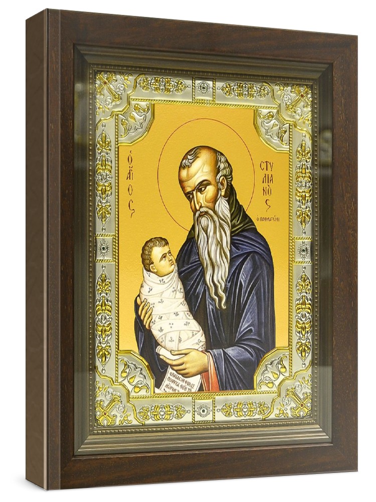 Икона стилиан пафлагонский (24х30), серебро. Икона выполнена на доске из дуба минеральными (природными) красками с использованием сусального золота по всем канонам Православия. Изображение трижды покрыто бесцветным лаком, что гарантирует долговечность, свежесть и чистоту красок. Оклад иконы выполнен из металлической основы, покрытой листовым серебром 925 пробы и 24-каратным золотом (имеется сертификат на обратной стороне), украшен стразами. Киот со стеклом, выполнен из массива дерева. Размер иконы с киотом: 24х30 см, без киота: 18х24 см. Производство: Италия-Россия.