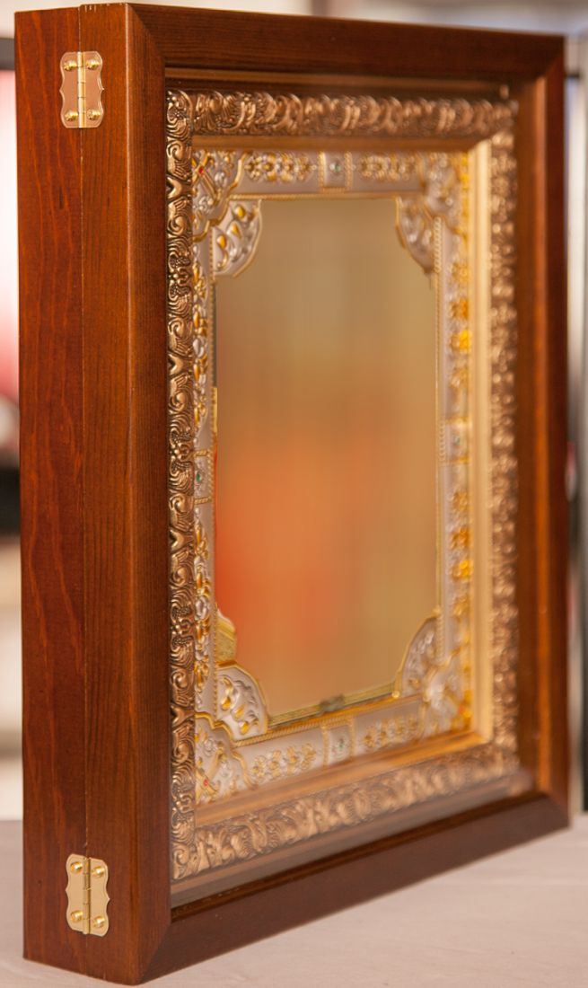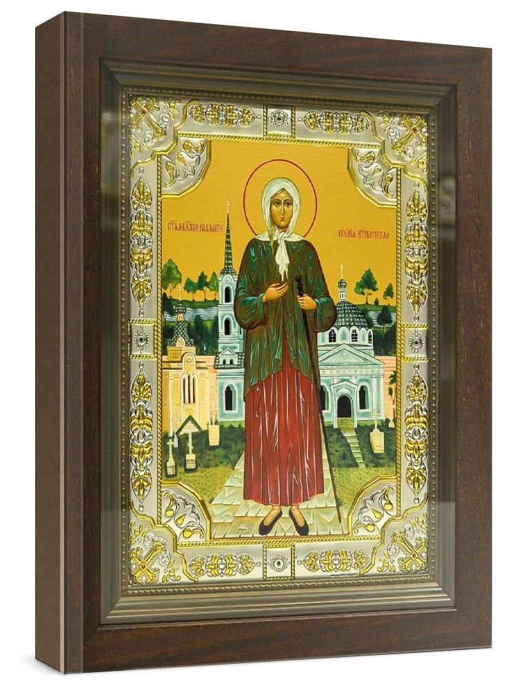 Икона ксения петербургская (24х30), серебро. Икона выполнена на доске из дуба минеральными (природными) красками с использованием сусального золота по всем канонам Православия. Изображение трижды покрыто бесцветным лаком, что гарантирует долговечность, свежесть и чистоту красок. Оклад иконы выполнен из металлической основы, покрытой листовым серебром 925 пробы и 24-каратным золотом (имеется сертификат на обратной стороне), украшен стразами. Киот со стеклом, выполнен из массива дерева. Размер иконы с киотом: 24х30 см, без киота: 18х24 см. Производство: Италия-Россия.
