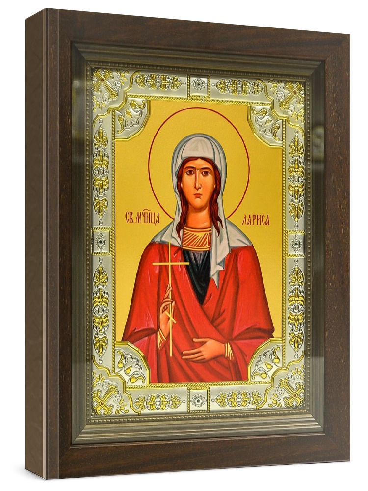 Икона лариса готфская (24х30), серебро. Икона выполнена на доске из дуба минеральными (природными) красками с использованием сусального золота по всем канонам Православия. Изображение трижды покрыто бесцветным лаком, что гарантирует долговечность, свежесть и чистоту красок. Оклад иконы выполнен из металлической основы, покрытой листовым серебром 925 пробы и 24-каратным золотом (имеется сертификат на обратной стороне), украшен стразами. Киот со стеклом, выполнен из массива дерева. Размер иконы с киотом: 24х30 см, без киота: 18х24 см. Производство: Италия-Россия.