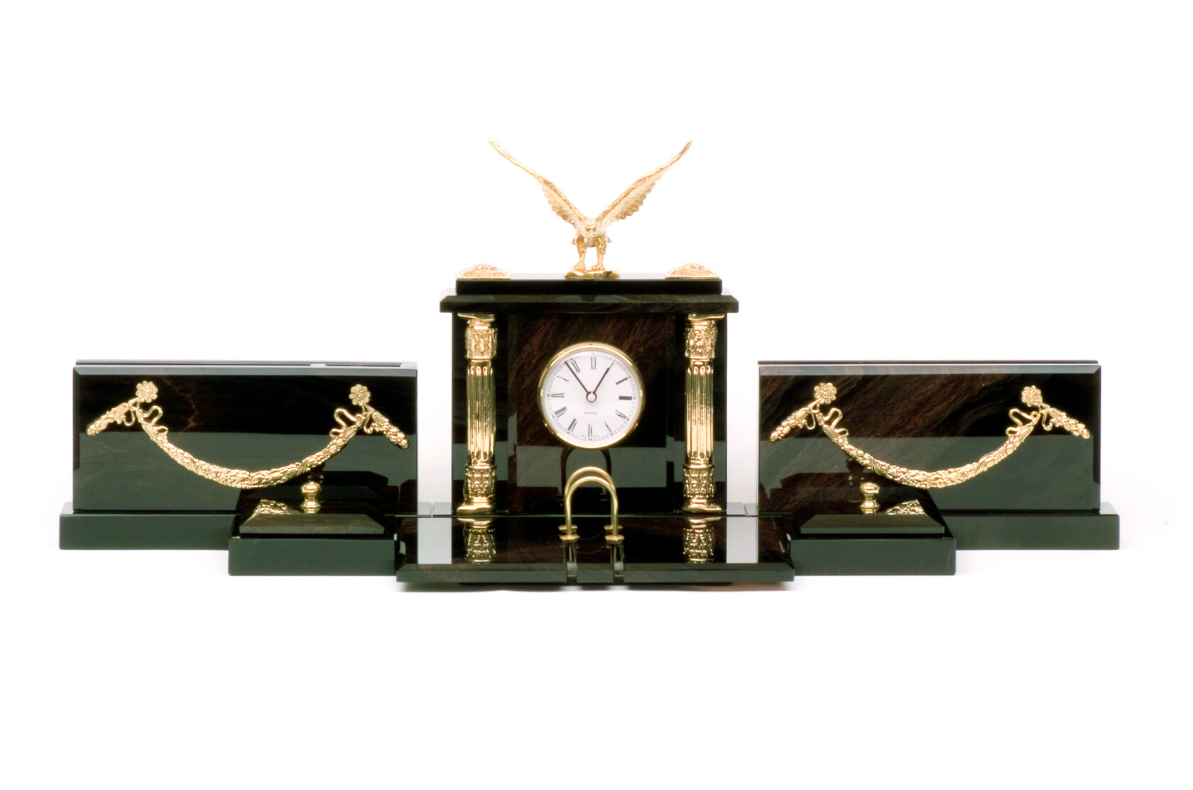 Ob_0081 настольный набор из обсидиана. Настольный письменный набор «0081» изготовлен из обсидиана, ручная работа. В комплект входят: подставка для бумаг ; подставка для карандашей и визиток ; подставка для календаря; шкатулки для мелочей - 2 шт. ; часы с батарейкой.
