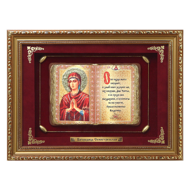 Православное панно богородица семистрельная сред. багет. Состав: дерево (бук), бумага, бархат, золотое покрытие Статус: Под заказ Размер: 36x27x5 см Размер с упаковкой: Х Х Вес (NETTO): 1.61