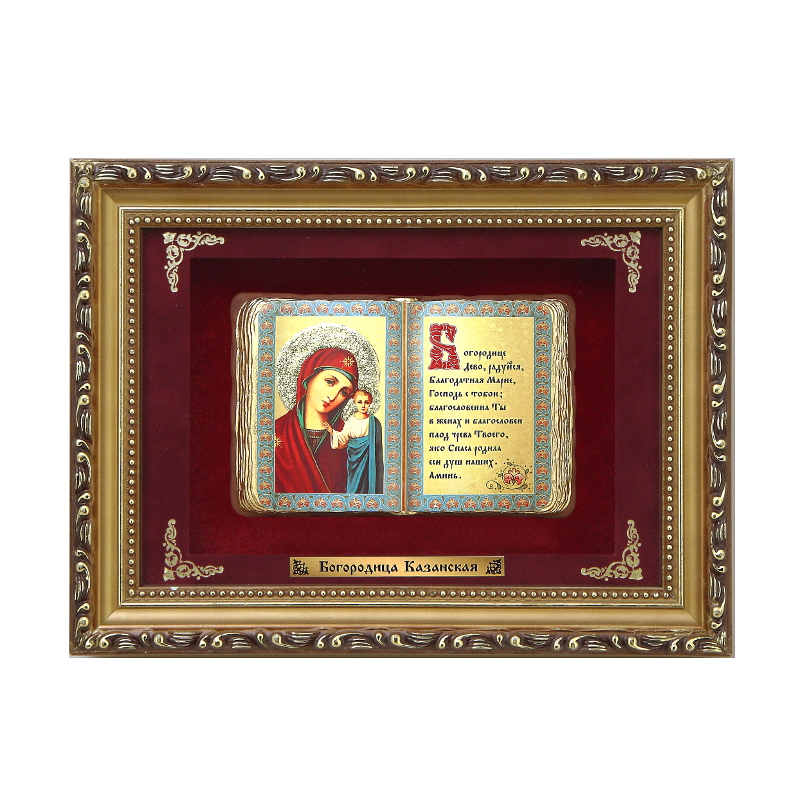 Православное панно казанская богородица мал. багет. Состав: дерево (бук), бумага, бархат, золотое покрытие Статус: Под заказ Размер: 27x20.5x5 см Размер с упаковкой: Х Х Вес (NETTO): 0.91