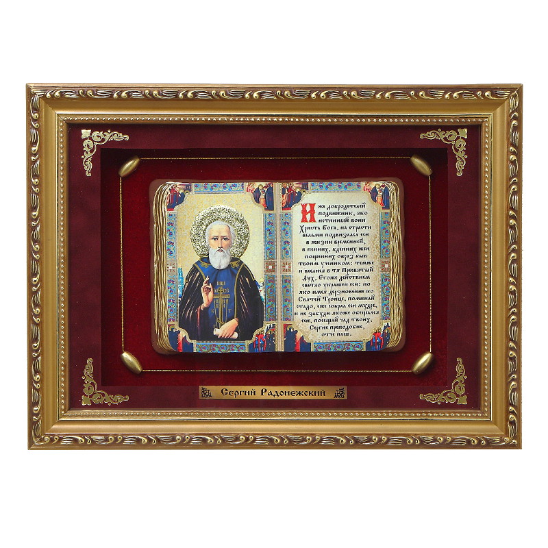 Православное панно сергий радонежский сред. багет. Состав: дерево (бук), бумага, бархат, золотое покрытие Статус: Под заказ Размер: 36x27x5 см Размер с упаковкой: Х Х Вес (NETTO): 0.61