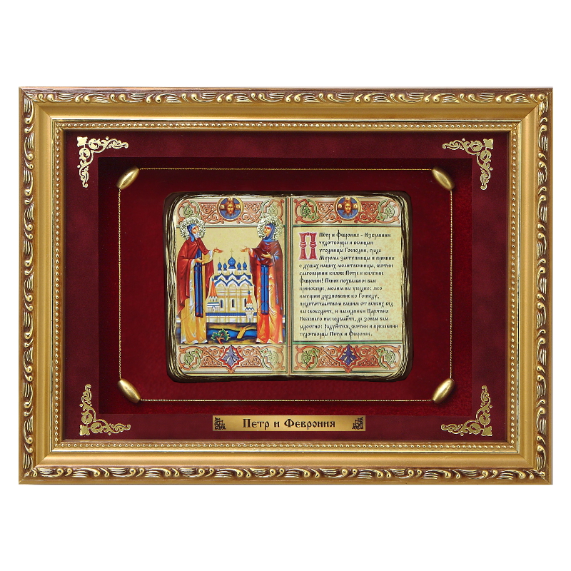 Православное панно петр и февронья сред. багет. Состав: дерево (бук), бумага, бархат, золотое покрытие Статус: Под заказ Размер: 36x27x5 см Размер с упаковкой: Х Х Вес (NETTO): 1.61