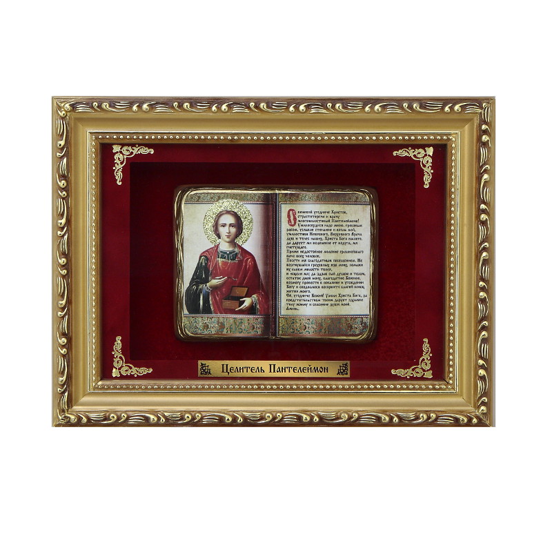 Православное панно пантелеймон целитель мал. багет. Состав: дерево (бук), бумага, бархат, золотое покрытие Статус: Под заказ Размер: 27x20.5x5 см Размер с упаковкой: Х Х Вес (NETTO): 0.91