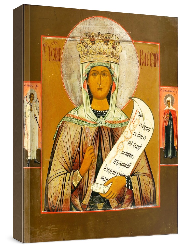 Икона варвара (копия старинной иконы). Икона на заказ. Срок изготовления - 1-2 недели. Изображение нанесено на основу из натурального хвойного дерева методом прямой печати. При работе соблюдены размерные пропорции и цветовая гамма оригинальной старинной иконы. Деревянная основа подвержена искусственному старению методом браширования, что делает икону более ценной и максимально похожей на многовековую семейную реликвию. Цена зависит от размера иконы (высота может незначительно отличаться от указанной величины в связи с точным соблюдением пропорций оригинала): 10x13*- 1500 руб. 30x40 - 5000 руб. 60x80 - 15000 руб. 15x18 - 2250 руб. 40x60 - 8000 руб. 80x120 - 20000 руб. 20x25 - 3000 руб. * - изготовление иконы 10х13 см возможно только при заказе от 3 шт.
