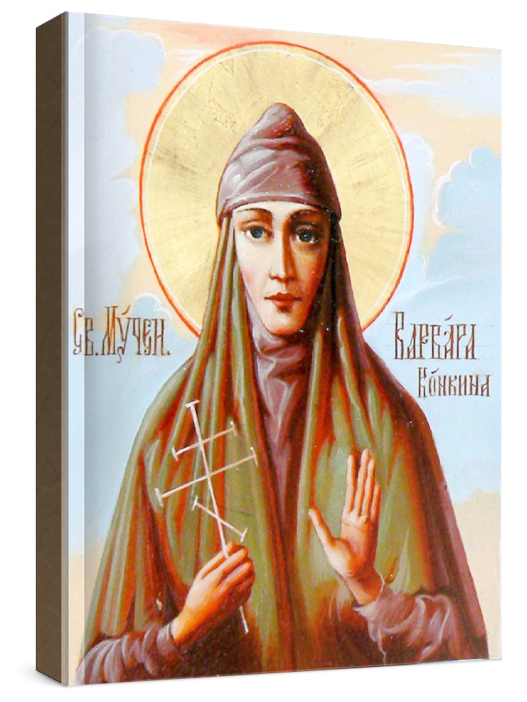 Икона варвара конкина. Икона на заказ. Срок изготовления - 1-2 недели. Изображение нанесено на основу из натурального хвойного дерева методом прямой печати (не полиграфия). Деревянная основа иконы подвержена искусственному старению. Лик покрыт специальным лаком, что защищает икону от воздействий окружающей среды и обеспечивает хранение иконы в первозданном виде в течение нескольких десятилетий. Цена зависит от размера иконы (высота может незначительно отличаться от указанной величины в связи с точным соблюдением пропорций оригинала): 10x13*- 1500 руб. 30x40 - 5000 руб. 60x80 - 15000 руб. 15x18 - 2250 руб. 40x60 - 8000 руб. 80x120 - 20000 руб. 20x25 - 3000 руб. * - изготовление иконы 10х13 см возможно только при заказе от 3 шт.
