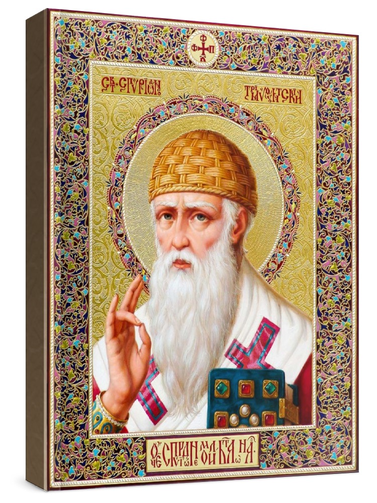 Икона спиридон тримифунтский. Икона на заказ. Срок изготовления - 1-2 недели. Изображение нанесено на основу из натурального хвойного дерева методом прямой печати (не полиграфия). Деревянная основа иконы подвержена искусственному старению. Лик покрыт специальным лаком, что защищает икону от воздействий окружающей среды и обеспечивает хранение иконы в первозданном виде в течение нескольких десятилетий. Цена зависит от размера иконы (высота может незначительно отличаться от указанной величины в связи с точным соблюдением пропорций оригинала): 10x13*- 1500 руб. 30x40 - 5000 руб. 60x80 - 15000 руб. 15x18 - 2250 руб. 40x60 - 8000 руб. 80x120 - 20000 руб. 20x25 - 3000 руб. * - изготовление иконы 10х13 см возможно только при заказе от 3 шт.