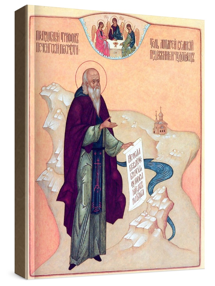 Икона трифон печенгский. Икона на заказ. Срок изготовления - 1-2 недели. Изображение нанесено на основу из натурального хвойного дерева методом прямой печати (не полиграфия). Деревянная основа иконы подвержена искусственному старению. Лик покрыт специальным лаком, что защищает икону от воздействий окружающей среды и обеспечивает хранение иконы в первозданном виде в течение нескольких десятилетий. Цена зависит от размера иконы (высота может незначительно отличаться от указанной величины в связи с точным соблюдением пропорций оригинала): 10x13*- 1500 руб. 30x40 - 5000 руб. 60x80 - 15000 руб. 15x18 - 2250 руб. 40x60 - 8000 руб. 80x120 - 20000 руб. 20x25 - 3000 руб. * - изготовление иконы 10х13 см возможно только при заказе от 3 шт.
