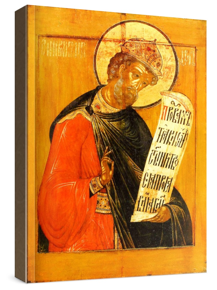 Икона давид, царь (копия старинной иконы). Икона на заказ. Срок изготовления - 1-2 недели. Изображение нанесено на основу из натурального хвойного дерева методом прямой печати. При работе соблюдены размерные пропорции и цветовая гамма оригинальной старинной иконы. Деревянная основа подвержена искусственному старению методом браширования, что делает икону более ценной и максимально похожей на многовековую семейную реликвию. Цена зависит от размера иконы (высота может незначительно отличаться от указанной величины в связи с точным соблюдением пропорций оригинала): 10x13*- 1500 руб. 30x40 - 5000 руб. 60x80 - 15000 руб. 15x18 - 2250 руб. 40x60 - 8000 руб. 80x120 - 20000 руб. 20x25 - 3000 руб. * - изготовление иконы 10х13 см возможно только при заказе от 3 шт.
